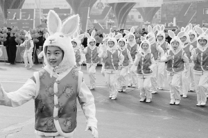 ▲ 2月17日,孩子们正在表演“玉兔迎春”。 当日,甘肃兰州新春社火大展示活动在城市中心广场上举行,来自兰州多个县区的1300名社火队员表演了特色浓郁的社火,吸引了上万名市民群众观看。