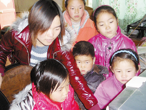 商水县舒庄乡乔庄村大学生乔亚珍,利用自己放寒假的时间,在自己家中创办了留守儿童之家,每天教他们唱歌、跳舞、打电脑,让孩子们度过了一个健康、快乐的寒假。图为乔亚珍在教几名留守儿童唱歌。(乔连军 摄)