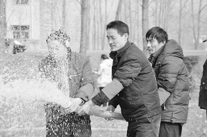 李埠口乡大学生村干部谷顺启自己拿出10800元钱,为19个行政村54户困难群众找管道设备、找帮扶人员,帮助群众缓解旱情。图为帮扶队员为小杨楼行政村苑庆学老人浇麦。樊葩菡 杨玉洁 童刘超 摄