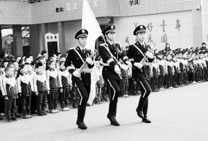 2月21日,武警战士护卫国旗。当日,济南市锦缠街小学邀请山东武警总队直属支队国旗护卫队的官兵们与小学生一起举行升旗仪式,迎接新学期的到来。 新华社记者 朱峥 摄
