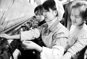 民工陆续返回 企业相继开工 2月21日,浙江省义乌某企业经编车间老员工阳春艳(中)正在车间教新工人打结接线。元宵节过后,在浙江义乌务工的许多老职工纷纷回到企业上班,许多职工还从老家带来大批新员工,为缓解企业用工难起到积极作用。