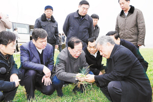 危朝安蹲下身子,拔起一棵麦苗与河南农业大学教授、农业部小麦专家组副组长郭天财交流起来:“麦苗长势不错,分蘖可以,根系多且下扎深。”危朝安诙谐地说:“需要使劲才能拔出来,是一类苗。”