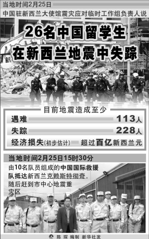 据新华社新西兰克赖斯特彻奇2月25日电 中国驻新西兰大使馆震灾应对临时工作组负责人25日说,目前有26名中国留学生在克赖斯特彻奇地震中失踪。