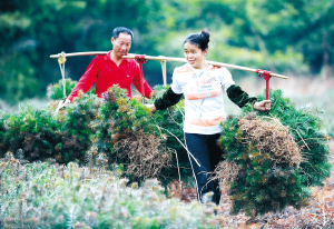 近日,江西省定南县天九镇的田间地头一片忙碌,当地农民正抓紧晴好天气收获苗木。村民介绍,目前苗木迎来销售旺季,供不应求,俏销广东、福建、广西等省份。 新华社记者 周科 摄