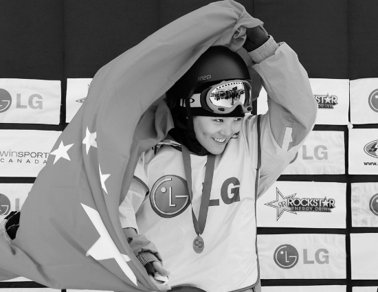 2月26日,中国选手蔡雪桐在颁奖仪式上。当日,在加拿大卡尔加里举行的2010-2011单板滑雪U型槽世界杯第四站比赛中,蔡雪桐以24.9分的成绩获得冠军。 新华社/路透