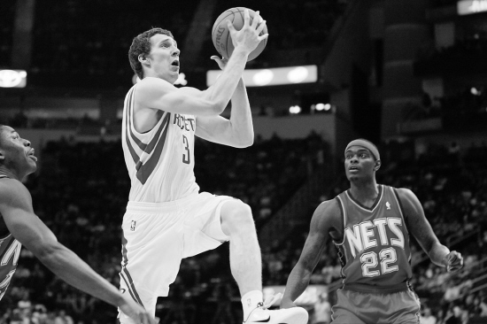 2月26日,火箭队球员德拉季奇(中)在比赛中突破上篮。当日,在2010-2011赛季NBA常规赛中,休斯敦火箭队主场迎战新泽西网队。 新华社发(宋穹摄)