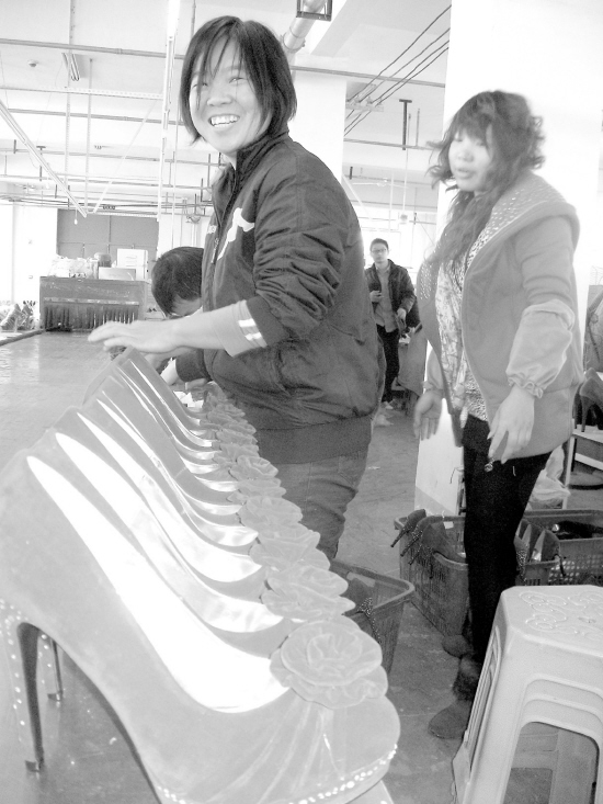 商水县结合春风行动,积极安置返乡农民工到鞋厂、纺织厂就业。目前,该县已安置6000多名农民工就业。图为返乡女工在卓尔鞋厂制作时尚女鞋。(吕耀光 马建国 摄)