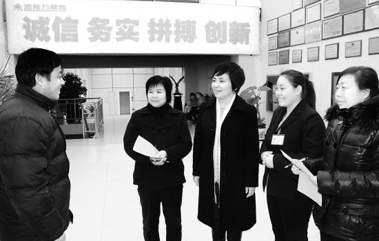 全国“两会”前夕,全国人大代表黄玉清(中)在企业就4050人员就业问题进行调研。 ( 记者 李寒 摄)