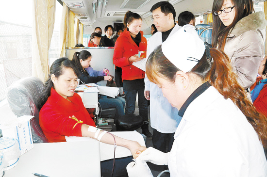 昨日,市中心医院的工作人员在踊跃献血。近期,我市医院临床出现A型血供血紧张,市中心医院紧急组织该院医护人员进行义务鲜血,确保血源正常供应。 记者 王映 摄