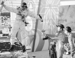 3月6日,一汽大众庆洋高尔夫车队车手陈德安(左)在闭幕式上将香槟倒入亚军的奖杯中。当日,2011年中国汽车拉力锦标赛(CRC)的揭幕战在黑龙江省五大连池市落下帷幕。一汽大众庆洋高尔夫车队车手陈德安以3小时7分52秒3的总成绩夺冠。
