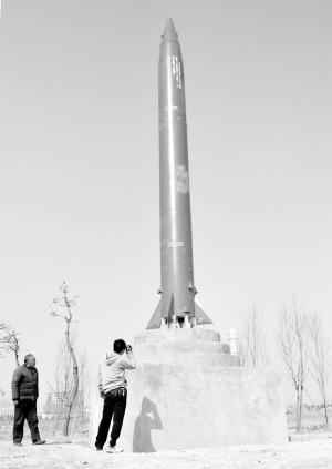 昨日运抵我市的导弹模型在周口公园刚一安装好就吸引了市民前来观看。据了解,该导弹模型由第二炮兵部队赠送,按1/2比例组装而成。