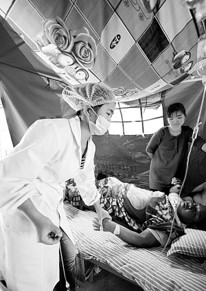 ▲3月11日,盈江县人民医院的护士正在给地震中的伤员换药水。新华社发