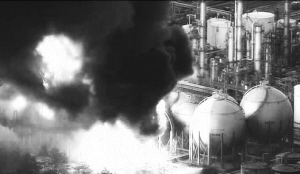 ▲这张3月11日NHK电视台电视节目截图显示的是日本地震灾区发生火灾的情景。