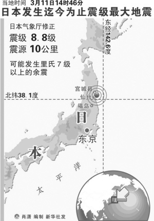 据新华社北京3月11日电 日本东北部地区11日下午发生里氏8.8级强烈地震,引发大规模海啸,造成重大损失。