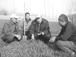 目前正是小麦返青期,扶沟县练寺镇派出农技人员分赴全镇各村的田间地头,向农民传授小麦返青期的管理技术。图为技术人员在焦花园村向农民讲解麦田管理技术。(陈奎 摄)