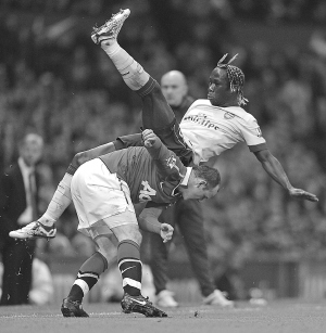 3月12日,曼联队球员鲁尼(下)与阿森纳队球员萨尼亚在比赛中争抢。当日,在2010-2011赛季英格兰足总杯四分之一决赛中,曼彻斯特联队主场以2比0战胜阿森纳队,晋级四强。