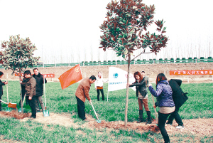 沈丘县组织青年志愿者以“学习雷锋活动月”为契机,开展植树造林活动。图为县电业局员工参加义务植树劳动。(韩东伟 摄)