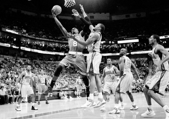 3月19日,凯尔特人队球员杰夫·格林(上左)在比赛中上篮。当日,在2010-2011NBA常规赛中,波士顿凯尔特人队客场以89比85战胜新奥尔良黄蜂队。 新华社/路透