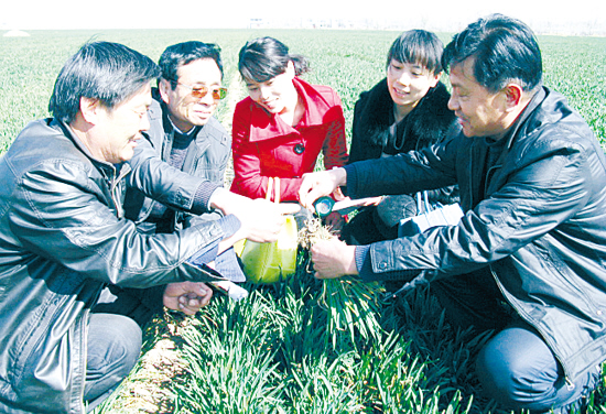 眼下,鹿邑县百万亩小麦已进入返青期,普遍长势良好。对此,该县及时组织农业科技人员深入田间地头,调查小麦生长情况。图为农业科技人员正在察看平衡施肥对小麦根系发育的影响情况。 (胡海云 周从来 摄)
