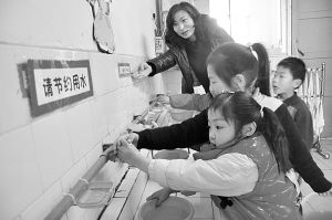 昨日,市实验幼儿园的小朋友在老师的引导下关紧水龙头,从小树立保护水资源的意识。