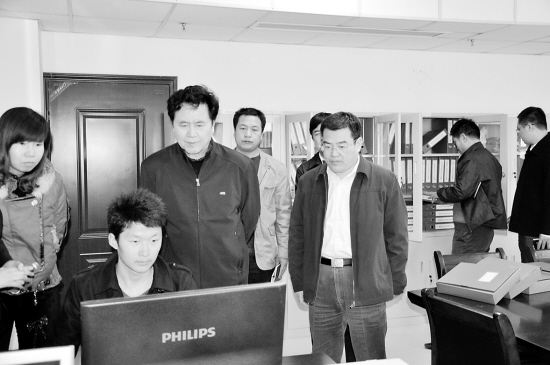 3月17日下午,省检查评估组组长阮仲亨一行3人在市、区有关领导的陪同下到川汇区对党务政务公开情况进行检查。图为评估组在区委书记孙敬林、区长郭志刚的陪同下浏览区政务网站 上各乡办的廉政宣传网页。 (樊葩菡 李效贤 高明富 摄)