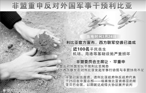 到访巴黎的非洲联盟(非盟)委员会主席让·平24日重申非盟反对外国军队干预利比亚局势,认为西方联军在对利比亚发起军事行动前与非盟协商不足。让·平表示,非盟已经发出邀请,请利比亚政府和反政府代表于25日在非盟总部所在地埃塞俄比亚首都亚的斯亚贝巴会面,以期就达成停火协议展开谈判。