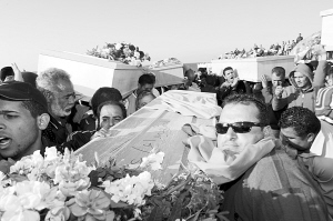 3月24日,在利比亚首都的黎波里,市民抬着即将下葬的棺椁走向一座公墓。利比亚官方当日宣布,近100名平民在西方联军空袭中丧生。