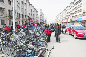 在四中附近小区居住的张先生说起此事十分无奈:“这段路上有市中心医院住院部,还有两所学校,人流、车流本来就比较大,再把自行车停到马路上,不堵车才怪呢!每天上下班时,这里都会出现拥堵,堵上十几分钟是经常的事。”