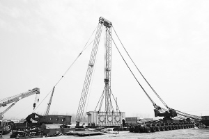 4月1日上午,周口500千伏变电站二期工程三相一体变压器通过水路顺利运抵周口港并成功起吊上岸,该变压器采用水陆联运的方式从沈阳、青岛、上海运至周口港,航程2250多公里。图为500千伏三相一体变压器在周口港起吊上岸的情景。 ( 魏树林 摄)