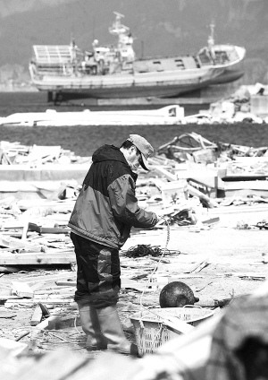 4月1日,在日本岩手县,一名渔民在废墟中搜寻仍有使用价值的渔具。日本警察厅当日宣布,截至当天15时,日本东北部海域发生的强震及其引发的海啸已确认造成11620人死亡,16464人失踪。