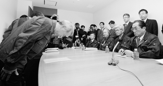 日本全国渔业协同组合联合会向东电抗议放射性污水排放 4月6日,日本东京电力公司常务广濑直己(左一)在位于东京的总部接受日本全国渔业协同组合联合会会长服部郁弘(右一)的抗议后鞠躬。当日,日本全国渔业协同组合联合会(全渔联)向东京电力公司递交抗议书,抗议东电向海中排放放射性污水。 新华社发