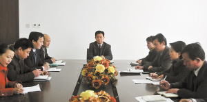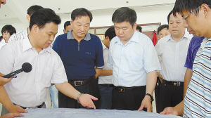 省体育局党组书记彭德胜(左二)、市长徐光、副市长李绍彬听取市体育场设计汇报。