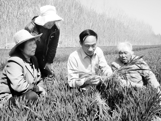 眼下正值小麦病虫害防治的关键时期,我市各县市区积极组织农技人员深入田间地头,指导农民喷施农药,进行病虫害防治,为今年夏粮丰收打下坚实基础。图为一农技人员正在为农民讲解病虫害防治知识。(记者 孙安平 摄)