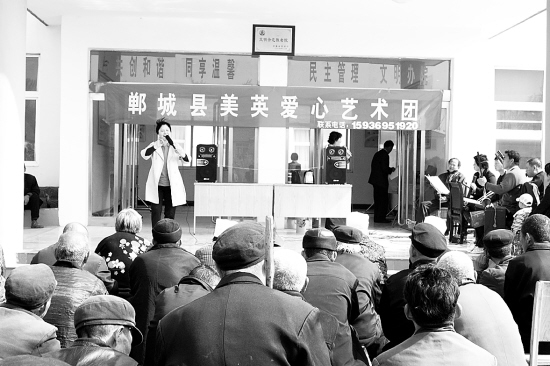4月14日上午,郸城县爱心艺术团来到西华中心敬老院,义务为老人们送上精彩的文艺演出。据了解,这个艺术团由郸城县文联干部蔡德龙夫妇牵头组织,自去年成立以来,已为我市各县市敬老院和离退休老人义务演出数十场次。记者 张猛 摄