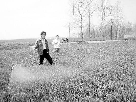 商水县舒庄乡乔庄村的村民正在对麦田进行病虫害防治。目前,随着气温逐渐升高,麦田红蜘蛛、蚜虫、白粉病等病虫害普遍发生,该乡举办6期小麦病虫害防治技术培训班,并组织全乡群众迅速掀起小麦病虫害防治高潮。(乔连军 摄)