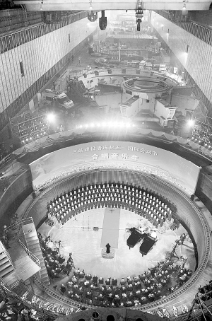4月15日,三峡大学教师合唱团和学生合唱团以及三峡建设者合唱团的成员们在三峡地下电站28#机组发电机定子铁芯内放声歌唱。当日,为迎接三峡地下电站即将投产发电、庆祝五一国际劳动节,三峡建设者合唱音乐会在湖北省宜昌市三峡工地地下电站28#机组发电机定子铁芯内隆重举行。在建的三峡地下电站位于右岸大坝山体内,设有6台70万千瓦的水轮发电机组。首批3台机组投产在即。 新华社发