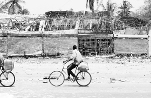 上图:4月14日,在科特迪瓦经济首都阿比让,行人经过一排被毁的店铺。新华社发