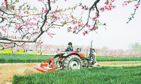 4月15日,几位农民在盛开的桃花园里进行春耕生产。近年来,西华县政府采取各项措施,引导全县农民进行林、果、粮、棉、油等立体种植和乡村旅游业的发展,使昔日黄泛区林茂果香。(记者 田维国 摄)