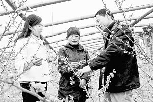 近日,汤阴县农技专家在该县韩庄乡大黄村党员示范特色果林种植基地为果农讲解桃树疏花、授粉技巧。眼下正值春季果树、病虫害防治的关键时期,该县120名农技专家深入果园林间,指导果农进行病虫害防治。(刘刚只 摄)