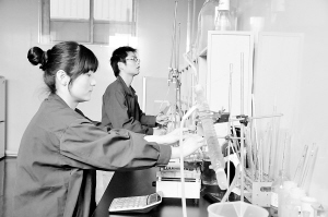 昨日,河南金丹乳酸科技有限公司的技术人员在做实验提取相关数据。多年来,该企业在郸城县委、县政府的正确领导和参与下,坚持走自主创新和产学研相结合的高新技术产业化发展之路,使企业核心竞争力不断提升,从而跃升为亚洲第一、世界第二的国际化企业。(记者 王映 摄)