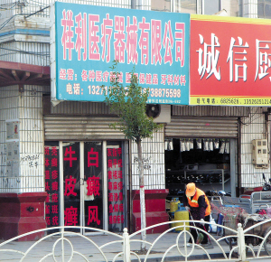 太康县卫生监督所位于太康县城主干道上,马某的诊所就位于卫生监督所南不足100米处。一间简陋的小屋上面挂着醒目的“祥和医疗器械有限公司和经营各种医疗器械医疗保健品、牙科材料”的绿色喷绘牌,在两扇玻璃推拉门上贴满了治疗“牛皮癣、白癜风、斑秃、体癣”等字。