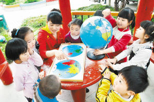 “我找到了。这个形状像大公鸡的就是中国。”一位小朋友高兴地说。昨日上午,市实验幼儿园的老师正在引导孩子通过地球仪认识地球,教育孩子节约环保、爱护家园。每年的4月22日是“世界地球日”。今年“世界地球日”的主题是——珍惜地球资源,转变发展方式。(记者 王映 摄)