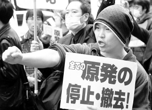 4月22日,示威者在日本东京街头参加反核游行。当日,由全日本学生自治会总联合会等组织的近百人在东京举行反核游行,呼吁东京电力公司废除核电站,并向东电提交了游行者签名的废核要求书。