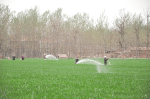 鹿邑县积极组织农机、水利、农业、科技等部门加大春季麦田管理力度,确保今年小麦丰产丰收。图为4月25日鹿邑县杨湖口镇积极组织农民给小麦浇水。(闫子健 摄)