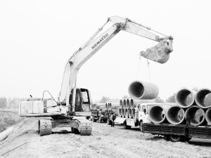 一路走来,记者在西迎宾大道加宽改造工程项目看到,整个工地上到处是一片忙碌景象,挖掘机、搅拌机等工程机械机声隆隆,开挖地槽、吊卸管道忙个不停。一旁,工人在吊车的帮助下,将一节节粗大水泥管铺设在一两米深的地槽中。
