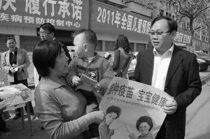 右图为市疾病预防控制中心主任梁照升(右一)向群众询问孩子免疫接种情况。