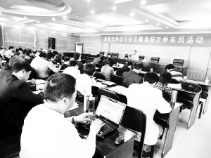 4月28日,文学爱好者边听作家讲课边做记录。为期3天的河南文学创作会议在淮阳召开,该活动由省作家协会、省文学院主办,来自全省各地的百余名作家和文学爱好者参加了会议。会议就当前文学创作面临的问题和如何实现突破进行交流,就作家提出的有价值选题进行充分探讨,就当前文学创作的总体态势和发展趋势进行研讨,并进行文学创作培训。(记者 侯俊豫 摄)