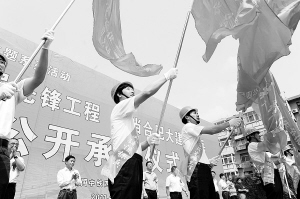 ▲重点工程建设者的承诺 4月30日,中铁四局的党员和劳动模范展示先锋工程旗帜。“五一”国际劳动节来临之际,奋战在国家重点工程京福铁路客运专线、合肥南环铁路线等一线的中铁四局举行了隆重的党员和劳动模范宣誓活动,努力践行党员和劳动模范先锋带头承诺,打造一流质量工程,为国家经济建设作出奉献。