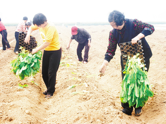 商水县郝岗乡海子涯行政村留守妇女正在示范田中帮助种烟大户移栽烟苗。近年来,该乡通过推广新品种、应用新技术,大力实施“订单生产、示范带动、科技兴烟”战略,切实提高了烟叶质量和烟农效益。今年,该乡植烟面积8000多亩,预计亩效益可超过3200元。(吕耀光 摄)
