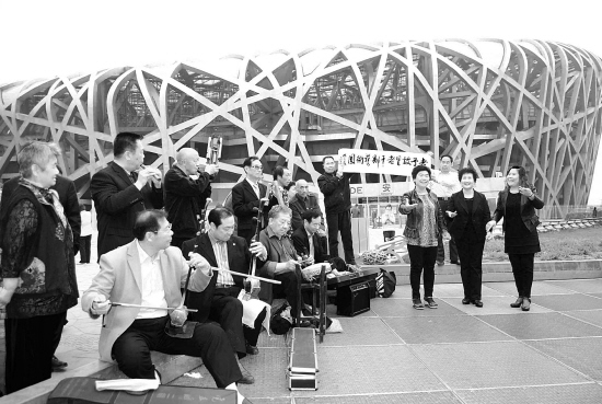 “五一”期间,鹿邑县委老干部局组织老干部艺术团远赴北京,慰问在京务工、经商的鹿邑、太康等周口籍人员,为他们送去了家乡人民的关爱和精彩的豫剧名段,获得了社会各界的好评。图为鹿邑县老干部艺术团在国家体育场(鸟巢)进行慰问演出。 张艳霞 蒋保庆 摄